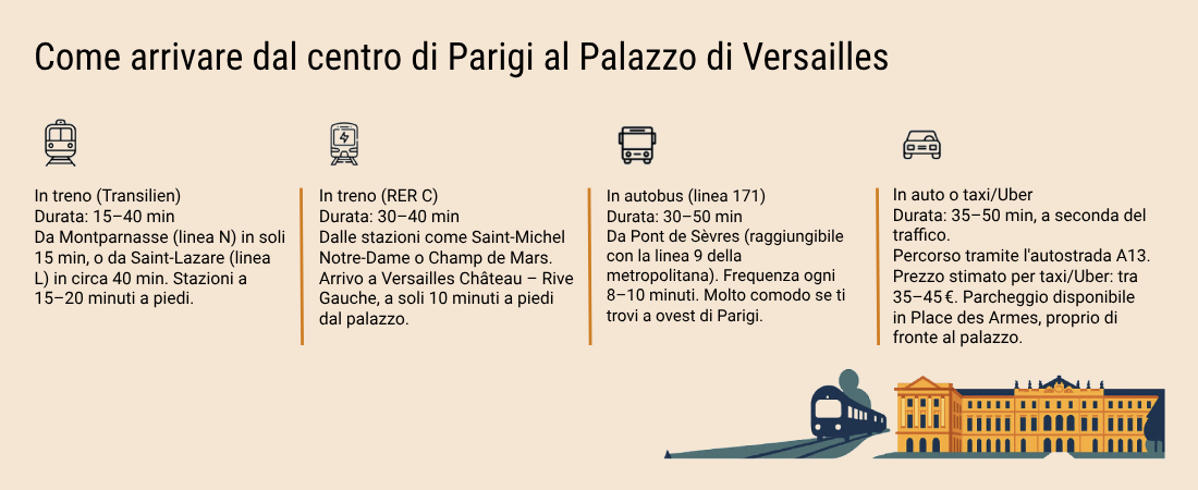 Se stai pianificando un'escursione a Versailles da Parigi, abbiamo una buona notizia: è molto più facile ed economico di quanto pensi. Grazie all’eccellente rete di trasporti pubblici parigina, raggiungere il Palazzo di Versailles è rapido, diretto e molto conveniente. In effetti, farlo in autonomia ha così tanti vantaggi che non vale la pena pagare un tour organizzato con trasporto incluso.